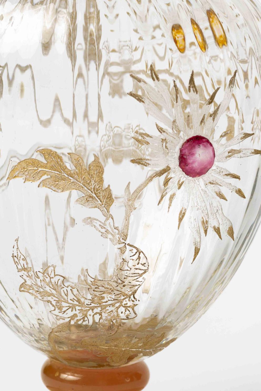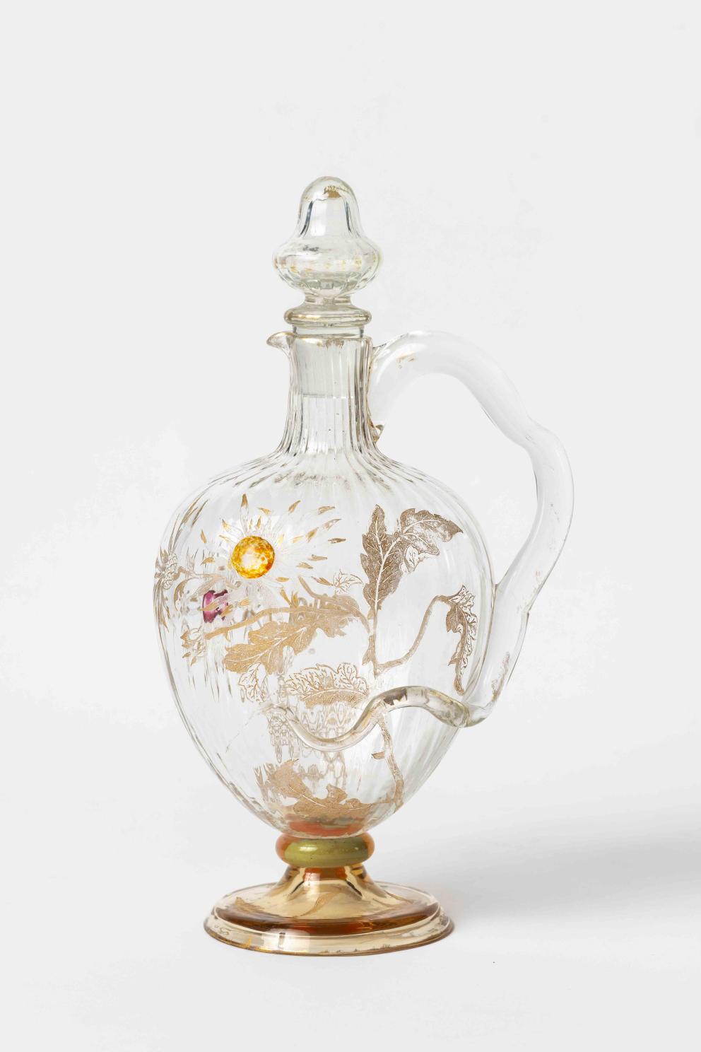 Édouard Hannon et Marie Debard ont confié au nancéien Émile Gallé la réalisation de l’ensemble de l’ameublement de leur maison, y compris leur service en cristal. Cette carafe à liqueur est identique à celle que possédait le couple et qui était utilisée dans le grand salon. Elle se distingue par ses motifs de chrysanthèmes en marqueterie de cristal taillé et coloré, ainsi que par des gravures dorées.