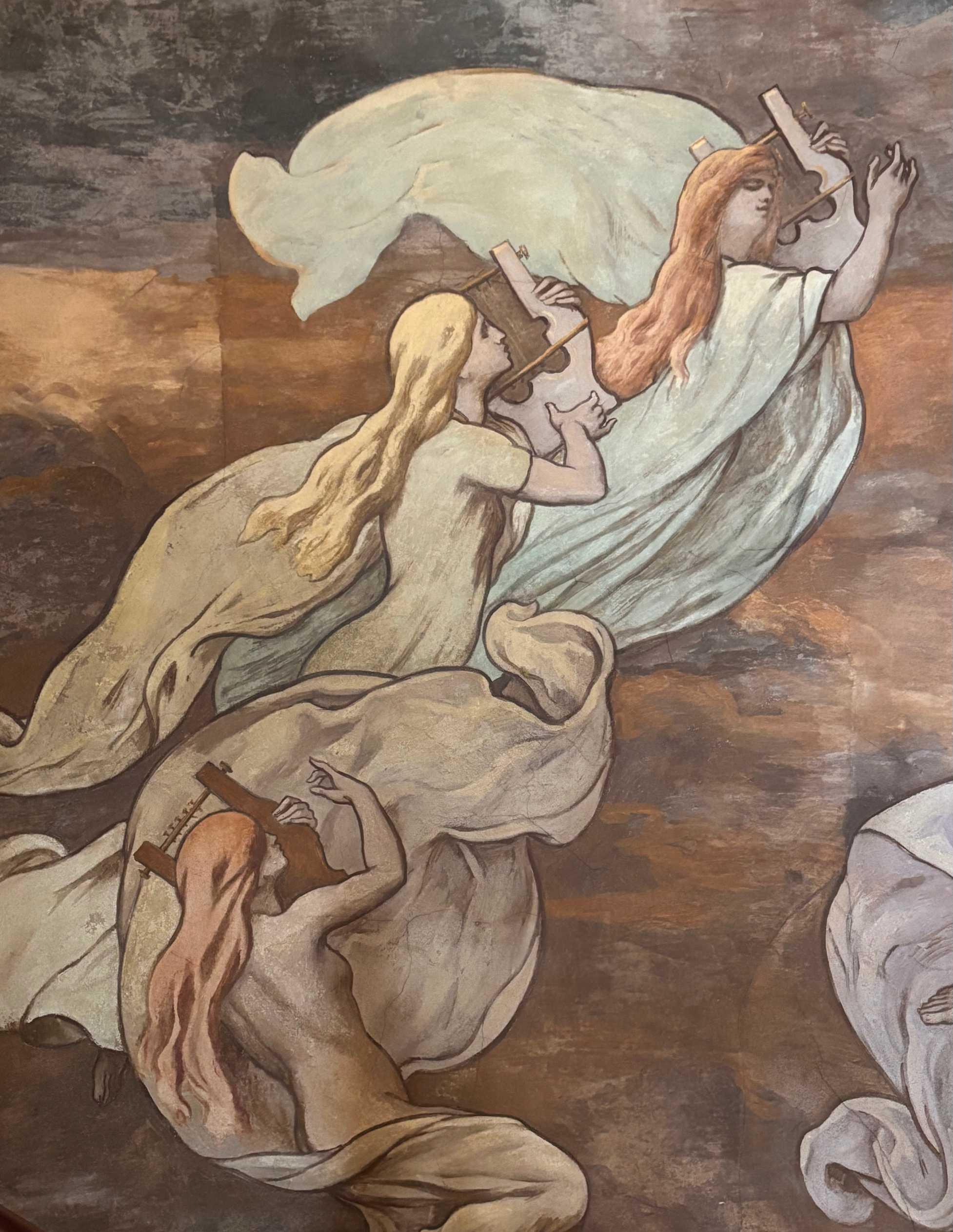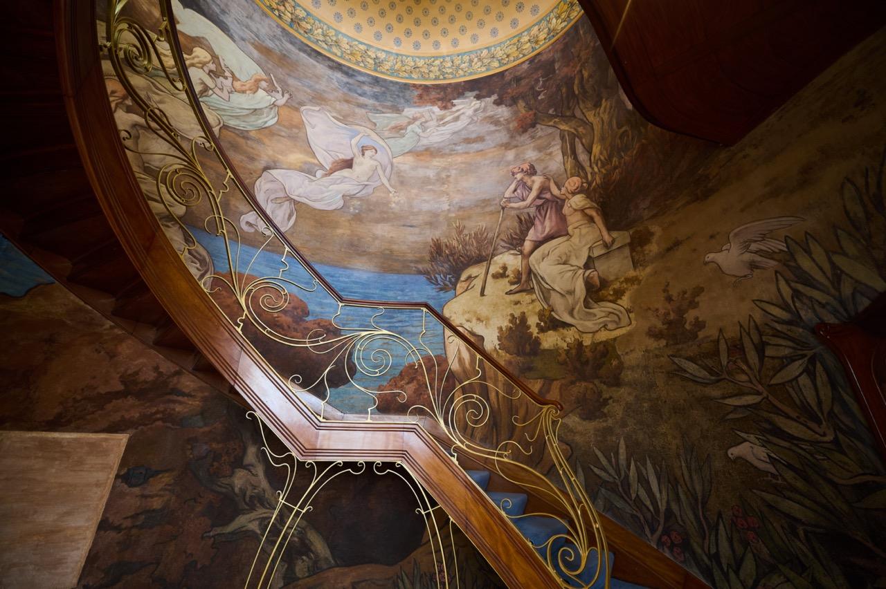 Au cœur de la Maison Hannon, la fresque Les Joies de la vie (1904) de Paul‑Albert Baudoüin constitue bien plus qu’un décor. Elle structure l’espace et transforme la cage d’escalier en un lieu de contemplation. Pensée dès l’origine pour s’intégrer à l’architecture, elle s’inscrit dans l’idéal symboliste de l’« art total », où peinture, architecture, lumière et ornements se fondent dans une expérience sensible. Monumentale et enveloppante, la fresque confère à cet espace de passage une atmosphère à la fois intime et solennelle, faisant du quotidien un temps de méditation. Par son sujet pastoral et allégorique, situé dans une Arcadie crépusculaire, elle célèbre l’harmonie de la nature et les « joies de la vie », dans une vision pacifiée du monde, fondée sur l’accord entre l’humain et le cosmos.