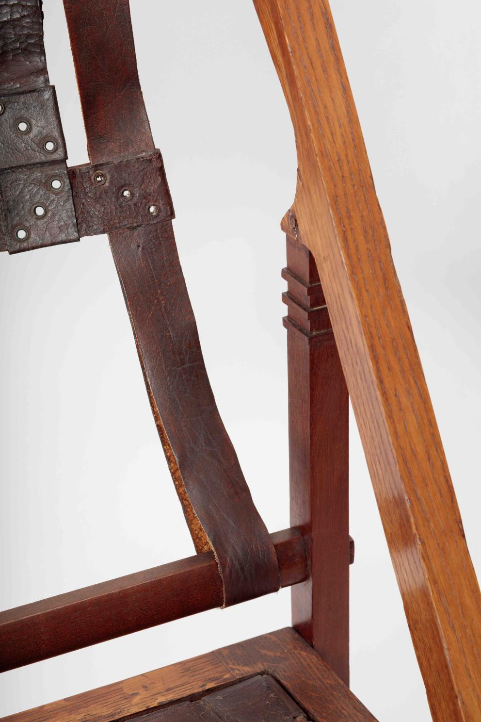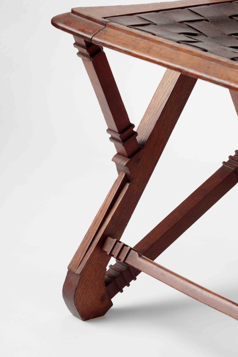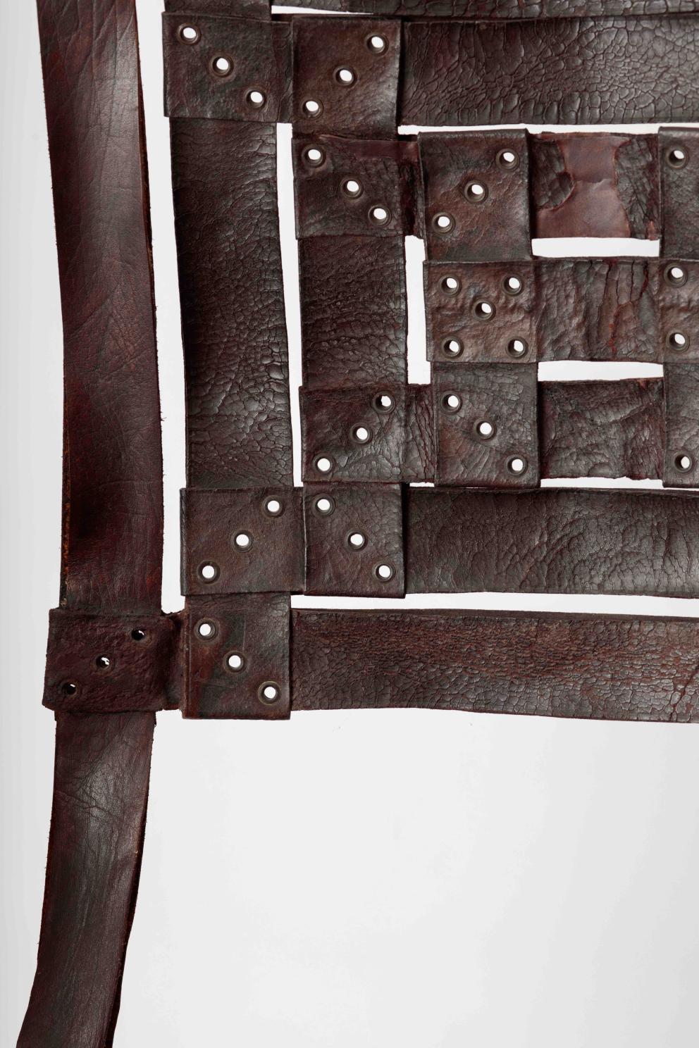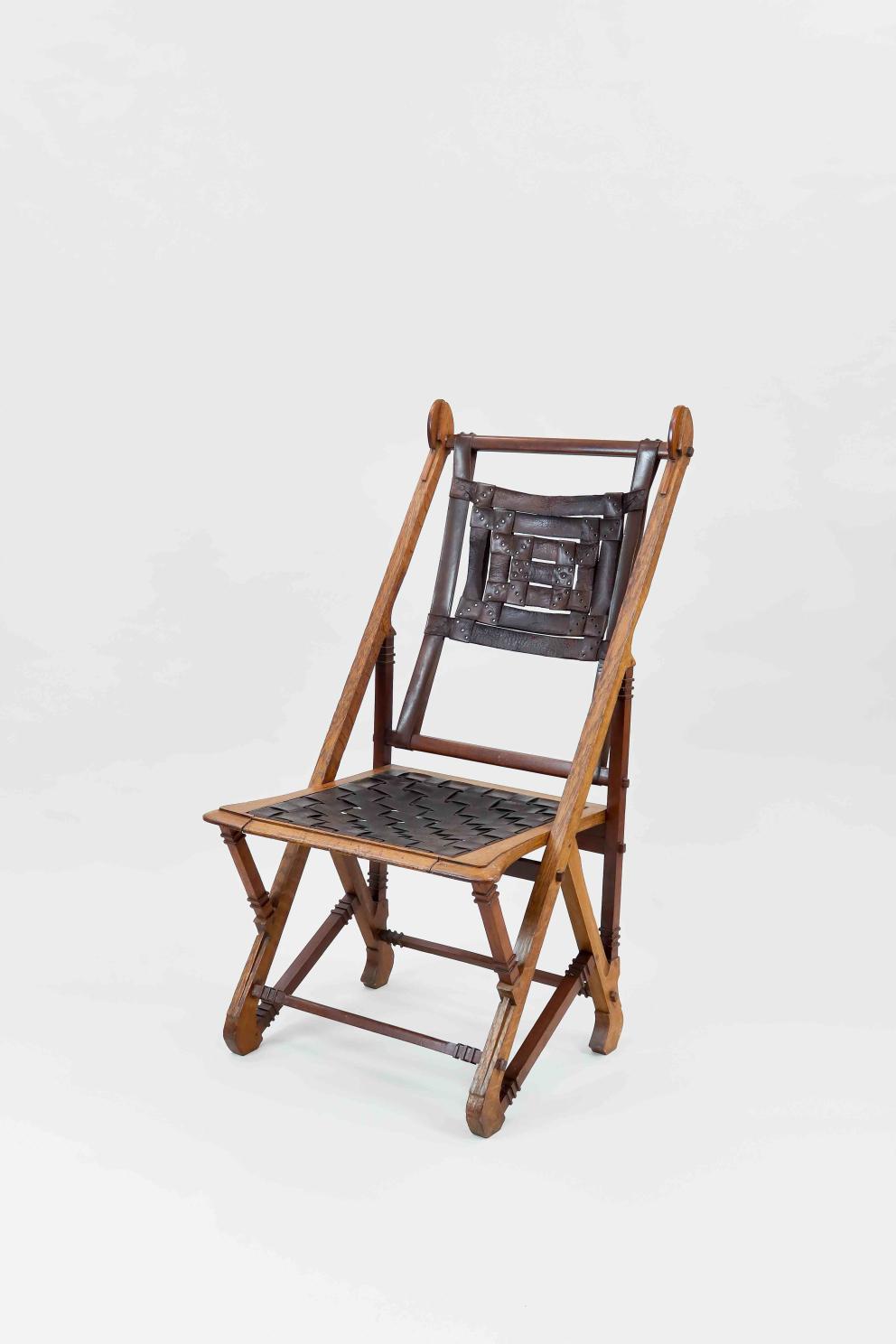 Sa structure enchevêtrée lui confère une allure imposante, mais aussi décharnée, fragile, avec un dossier en lamelles de cuir tressé qui évoque une toile d’araignée suspendue. Le tressage rappelle l’entrecroisement d’une fenêtre chinoise, tandis que l’assise suggère une cuirasse médiévale ou romaine. S’il n’est pas réellement pliable, sa forme donne l’illusion des chaises traditionnelles d’Asie ou d’Afrique. Cette illusion renvoie à un exotisme aux influences orientales et africaines, célébrées lors de l’exposition de Tervuren en 1897. Hankar révèle son talent pour intégrer des styles historiques et extra-européens, avec une préférence marquée pour l’Extrême-Orient, probablement influencée par son commanditaire Philippe Wolfers, qui l’affectionnait particulièrement.
