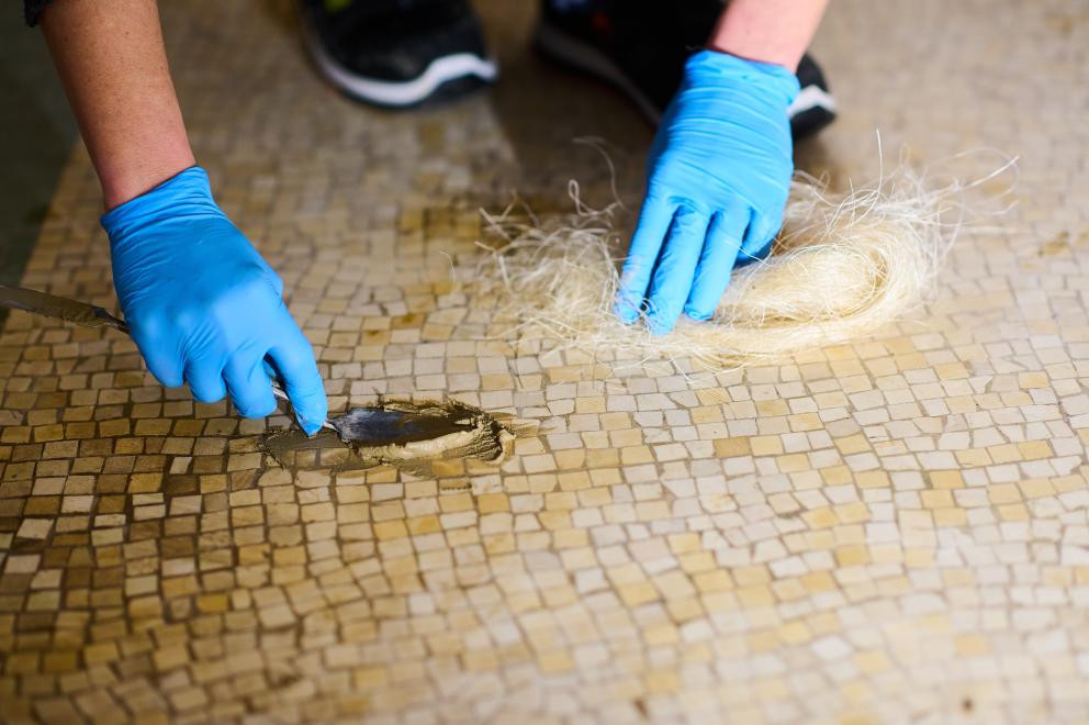 Pour combler les lacunes des mosaïques, il n'est pas toujours facile de trouver de nouveaux matériaux de la même couleur et du même ton que les roches d'origine. C'est pourquoi nous avons dû utiliser beaucoup de matériaux recyclés, comme des cheminées démontées ou de vieilles plinthes. Parfois, lorsque les matériaux d'origine ne sont plus disponibles, il est nécessaire de fabriquer de nouveaux tessons de céramique ou de résine.