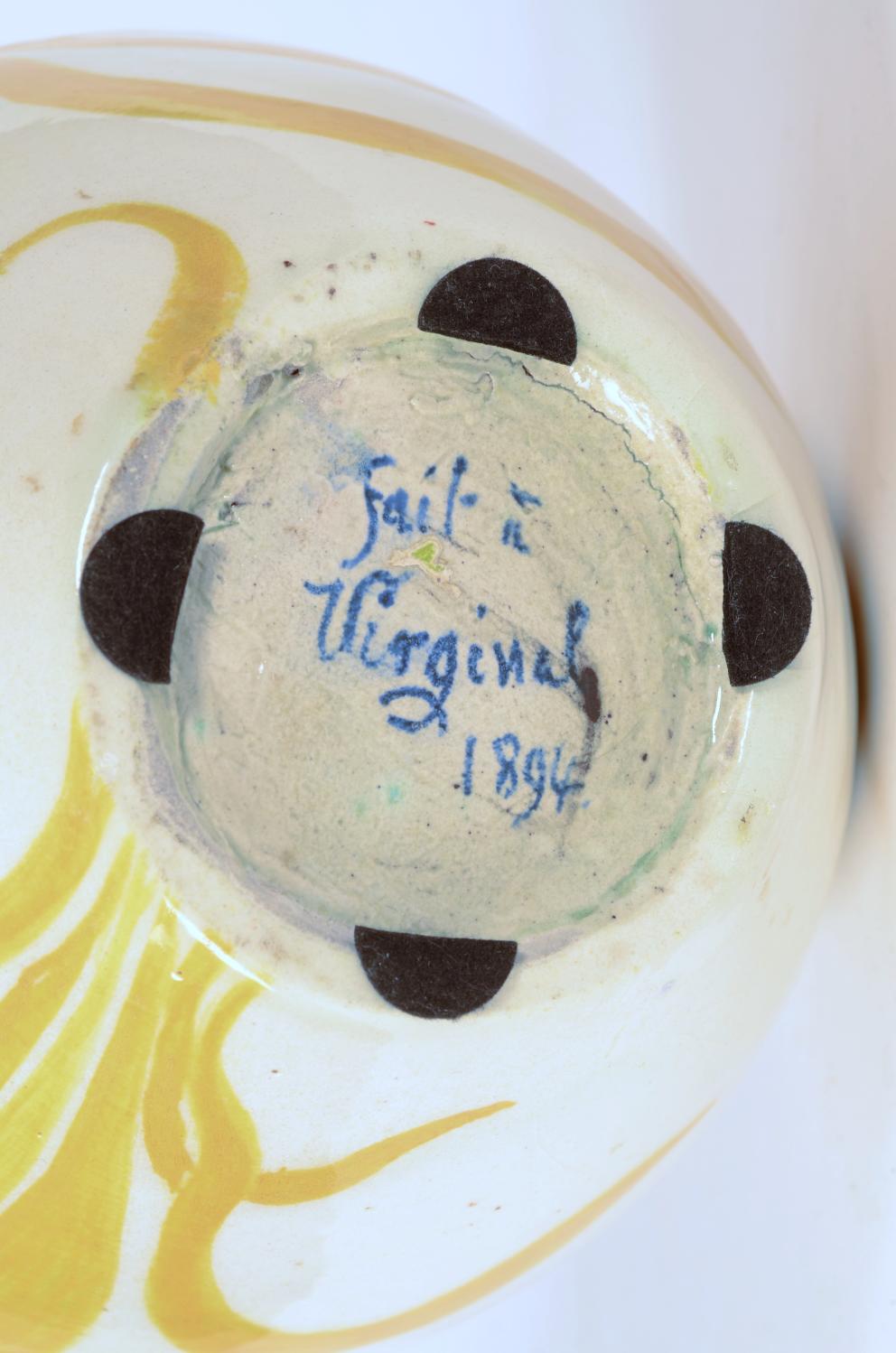 In 1894, wanneer hij deze vaas creëert, werkt Finch al een jaar in de Virginal-fabriek. Hij maakt gebruik van een bijzonder witte, ondoorzichtige klei, vergelijkbaar met het "fijne aardewerk" dat hij eerder in de Kéramis-fabriek had gebruikt. Deze wit-gele vaas, in tegenstelling tot andere, meer ruwe werken van de kunstenaar, lijkt te zijn vervaardigd door een ervaren pottenbakker. Het decoratieve patroon toont Finchs interesse in experimenten, geïnspireerd door Oost-Aziatische keramiek. Gele, organische vormen vloeien over de witte ondergrond en volgen de ronde vormen van de vaas.